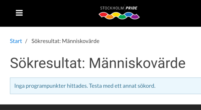 Vår granskning visar att begrepp som normalt uppfattas positiva i samhället, såsom ansvar och moral, förekommer ytterligt sällan i Prideprogrammet, och då oftast i negativ kontext. Mest uppseendeväckande är att begreppet ”människovärde” eller formuleringen ”alla människors lika värde” förekommer noll (0!) gånger i det omfattande programmet. Den allmänna bilden av Pride som en förkämpe för alla människors värde stämmer inte; festivalen verkar handla om något helt annat.